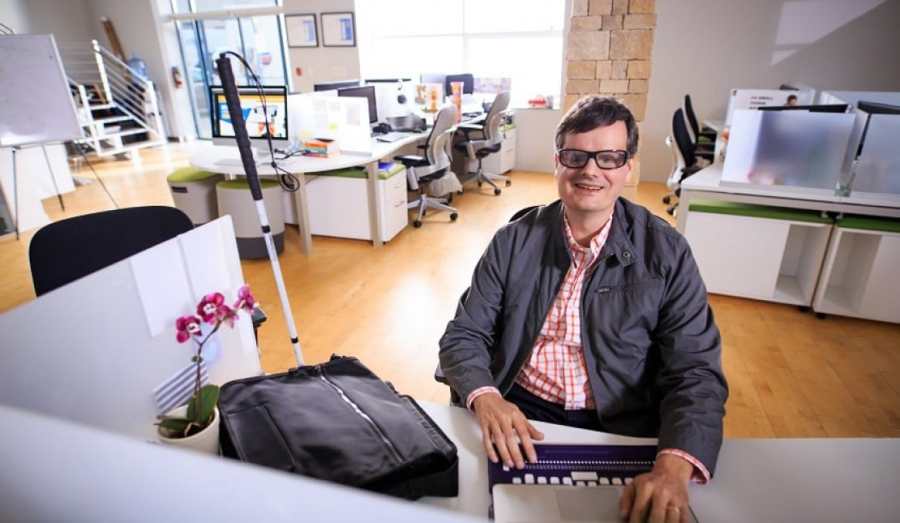 Image Caption: Martin Courcelles, smiling to the camera while sitting at a desk in an open-floor office environment, working on a laptop utilizing a Braille display and input adapter.
