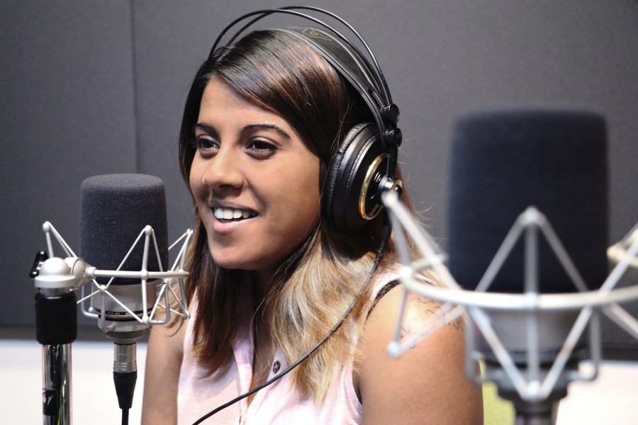 Image Caption: Ramya Amuthan, wearing large over-the-ear headphones, sitting in front of a high-quality microphone that’s in an anti-vibration mount and seems to be about to speak.
