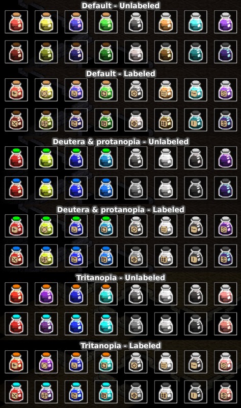 This particular issue came up with potions. Potions come in various types, 16 in total, and they all have different colors. While you can mouse over a potion to see what it does (once you’ve discovered that anyway), I didn’t feel that was enough. Players should be able to distinguish potions at a glance, not have to spend lots of time digging through their inventory looking for the right one.