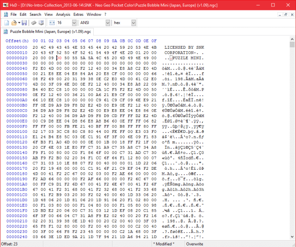 Since I do own an original Neo Geo Pocket, I concluded that I’d be better off experiencing Puzzle Bobble Mini on that system. However, I wasn’t ready to give up on activating symbol bubbles on the Neo Geo Pocket Color! Using my computer, I loaded Puzzle Bobble Mini into a hex editor and began my search for values that would force the game to use symbols. I found out that the ROM header (a small set of values containing various pieces of information about a game) contained a hex value that determines whether or not a game can be played in color. I changed this value, 10 (color compatible) to 00 (monochrome only), and hoped for the best.